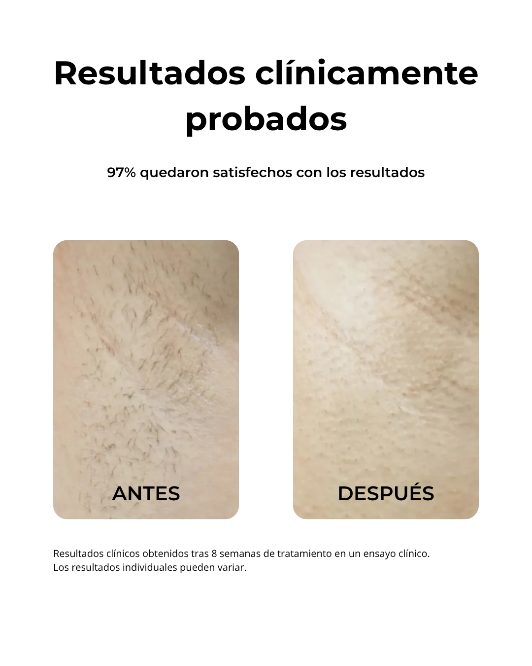 Deberías ver una depilación de hasta el 80% siguiendo el plan de tratamiento programado. Al usar el dispositivo, estás destruyendo los folículos pilosos que se encuentran actualmente en la fase anágena de crecimiento del vello. Es posible que el vello que no estaba en la fase anágena durante el tratamiento siga creciendo. Por eso, recomendamos realizar un tratamiento de mantenimiento.
